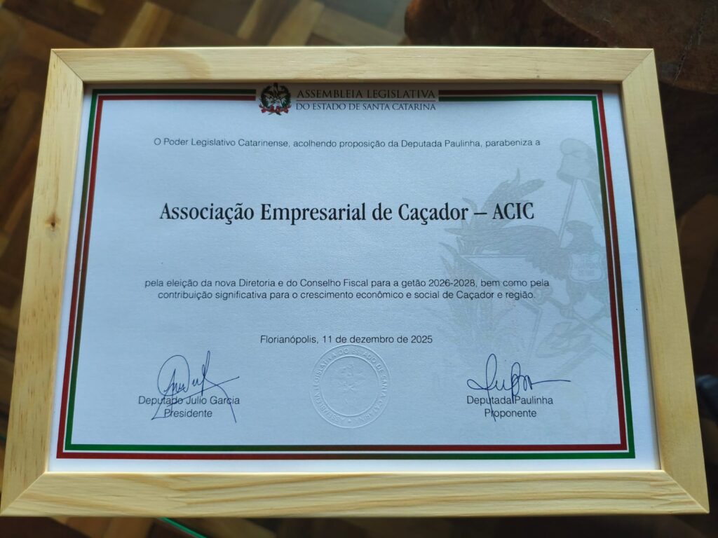 Na oportunidade, a deputada entregou ao presidente da ACIC uma placa de reconhecimento da Assembleia Legislativa de Santa Catarina, que parabeniza a entidade pela eleição da nova Diretoria e do Conselho Fiscal para a gestão 2026-2028, bem como pela contribuição significativa para o crescimento econômico e social de Caçador e região.