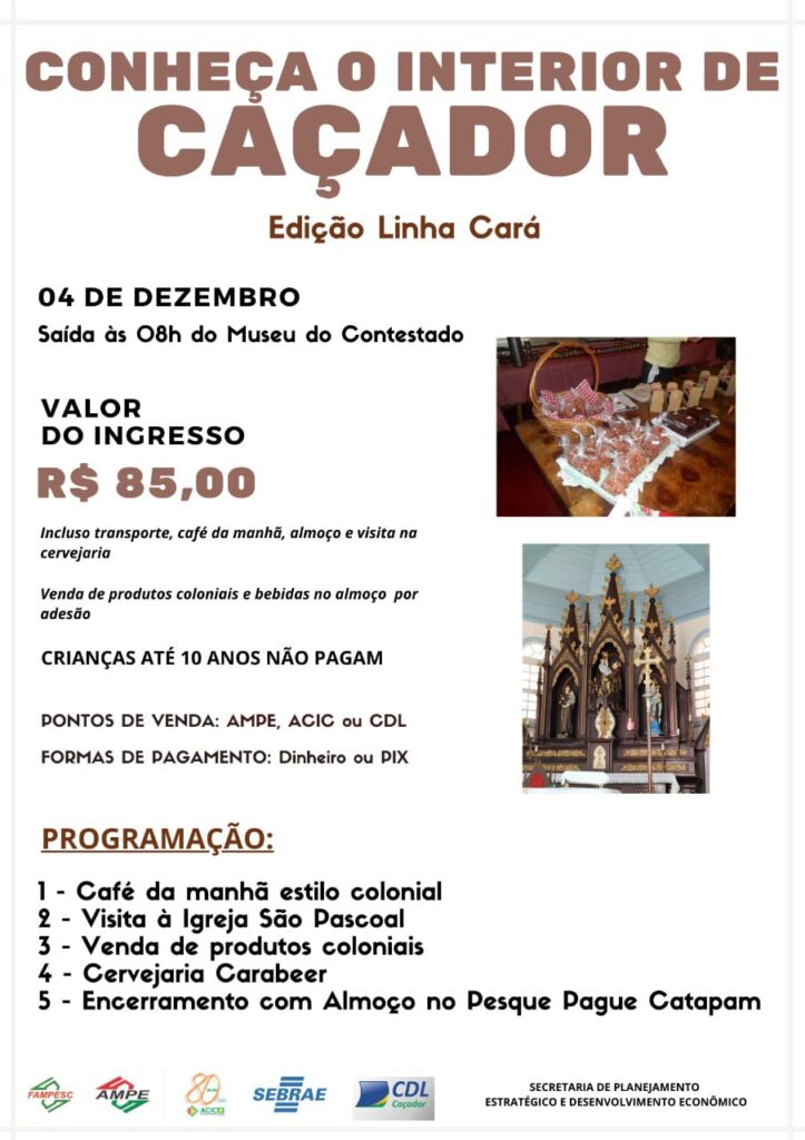 A Associação das Micro e Pequenas Empresas de Caçador (AMPE) por meio de seu Núcleo de Turismo, promove no dia 4 de dezembro o projeto “Conheça o Interior de Caçador”, desta vez, com destino a comunidade da Linha Cará.