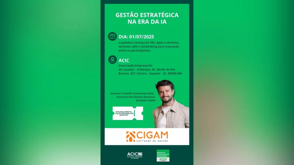 A ACIC (Associação Empresarial de Caçador), por meio do Núcleo de Tecnologia da Informação e em parceria com a empresa Cigam, promove na próxima terça-feira (1º de julho) a palestra “Gestão Estratégica na Era da IA”, com foco na aplicação da inteligência artificial (IA) na gestão de negócios.