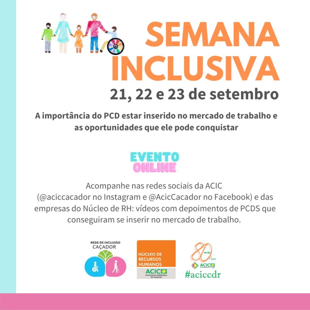 O Núcleo de RH da Associação Empresarial de Caçador (ACIC) promove nestes dias 21, 22 e 23 de setembro em formato online, a Semana Inclusiva, onde por meio de vídeos, irão apresentar histórias de pessoas com deficiência (PCDS), que se inseriram no mercado de trabalho, as conquistas e as oportunidades que surgiram. Diversas empresas caçadorenses estão em busca de PCDS para compor seu quadro de colaboradores, e o Núcleo de RH deseja com este evento apresentar esta informação principalmente para aqueles que ainda não buscaram seu espaço.