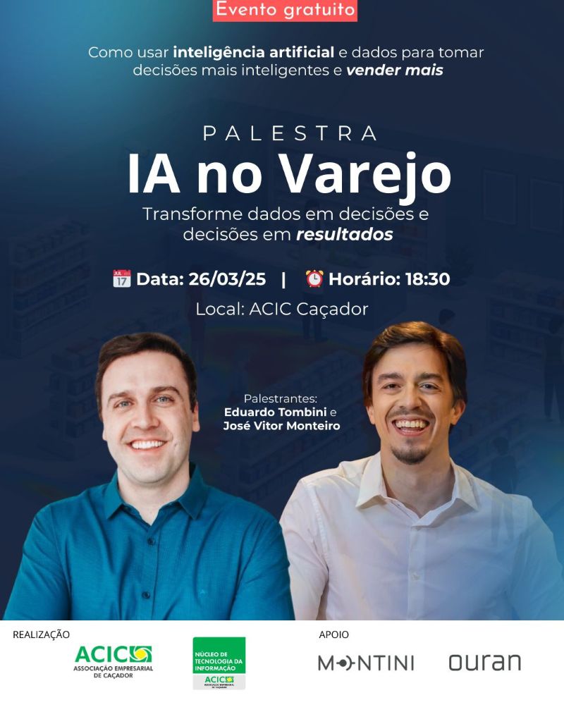 O auditório da Associação Empresarial de Caçador (ACIC) recebe na noite desta quinta-feira (26) a partir das 18h30 uma palestra gratuita com o tema “IA no Varejo – Transforme dados em decisões e decisões em resultados”, com os palestrantes Eduardo Tombini e José Vitor Monteiro.