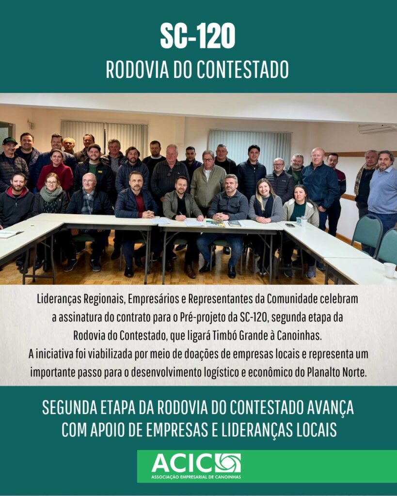 Dia 21 de julho, foi assinado o contrato que dará início à elaboração do pré-projeto de pavimentação da denominada “Rodovia do Contestado” SC-120, no trecho que liga os municípios de Timbó Grande, Ireneópolis, Bela Vista do Toldo e Canoinhas. A iniciativa marca a segunda etapa da chamada “Rodovia do Contestado”, projeto estruturante que pretende conectar, por meio de uma rodovia pavimentada, municípios com alto potencial produtivo e logístico da região. A assinatura aconteceu na sede da Associação Empresarial de Canoinhas (ACIC), entidade que coordena a iniciativa com apoio de empresas da região.